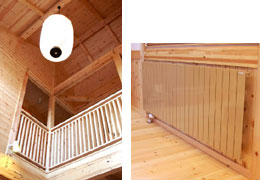 左: リビングからの吹き抜けが、とても開放的。照明はインテリアとしてもオシャレな特注の提灯。