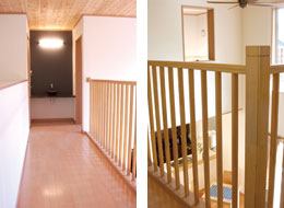 右: 吹抜けに面した窓は、風の透通る工夫がされている。